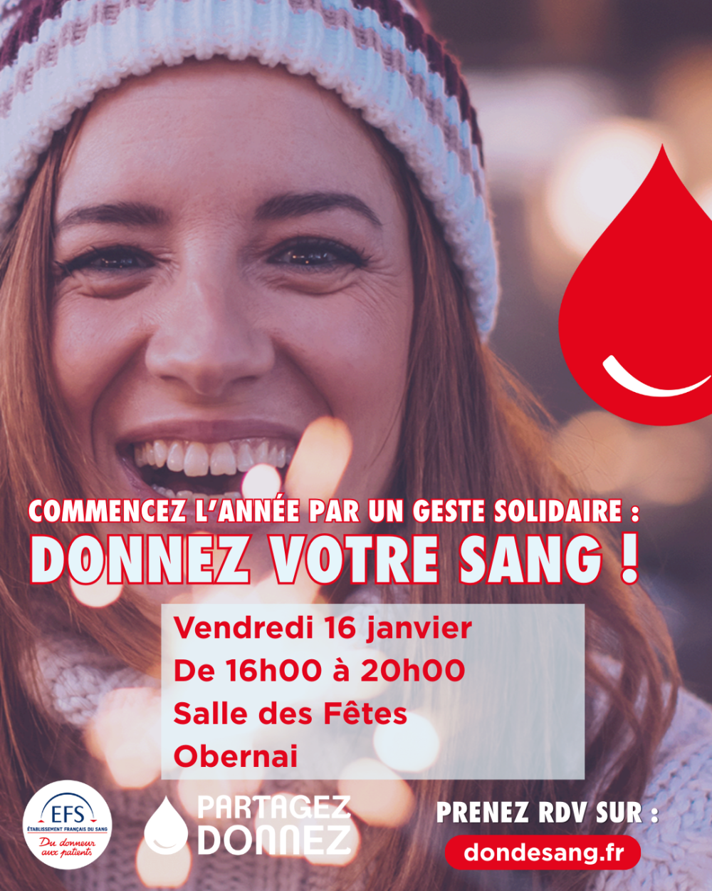 L'Etablissement Français du Sang avec l'association "Don du Sang Obernai" organise une collecte de sang le vendredi 16 janvier 2026 de 16h à 20h à la Salle des Fêtes, rue de Sélestat à Obernai.
